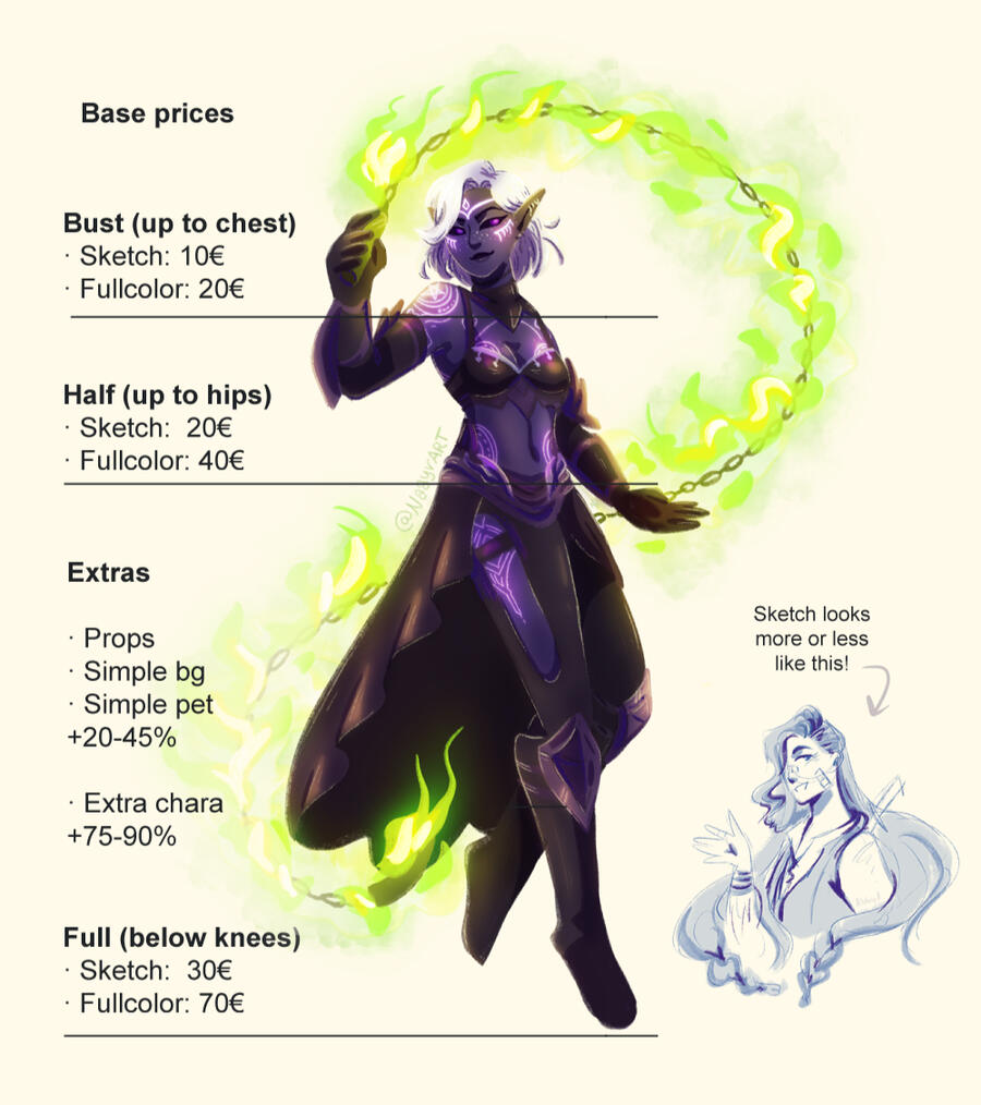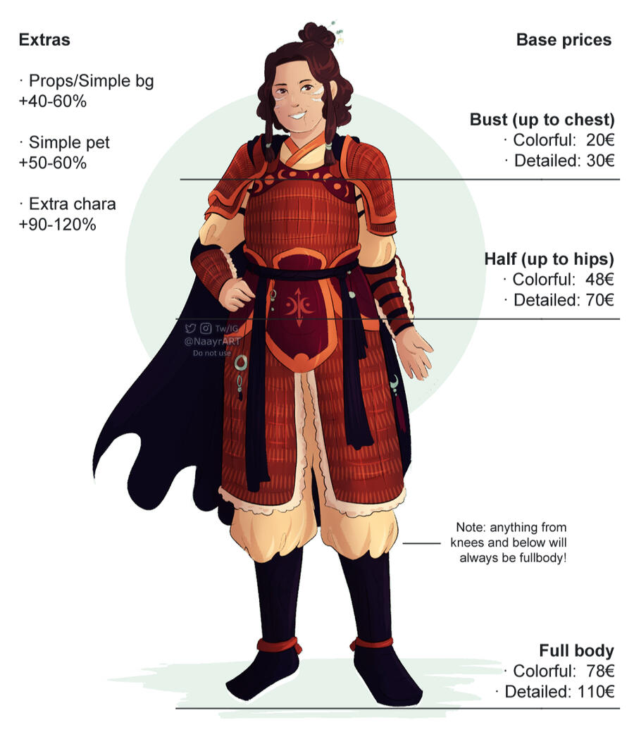 Payment must be sent full upfront if the total price is under 30€. Above that, it can be half upfront + half before delivery. Art must be fully paid before delivery.